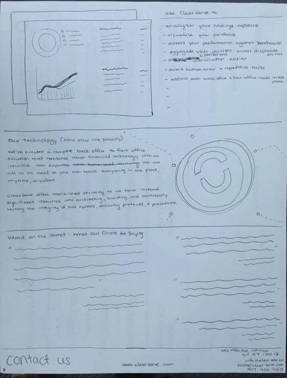 In order to give potential clients more information about ClearServe, I put together a marketing one sheet that could be sent or given to clients without additional explanation. I worked on drafting copy for the one page using a shared Google Doc with my team.